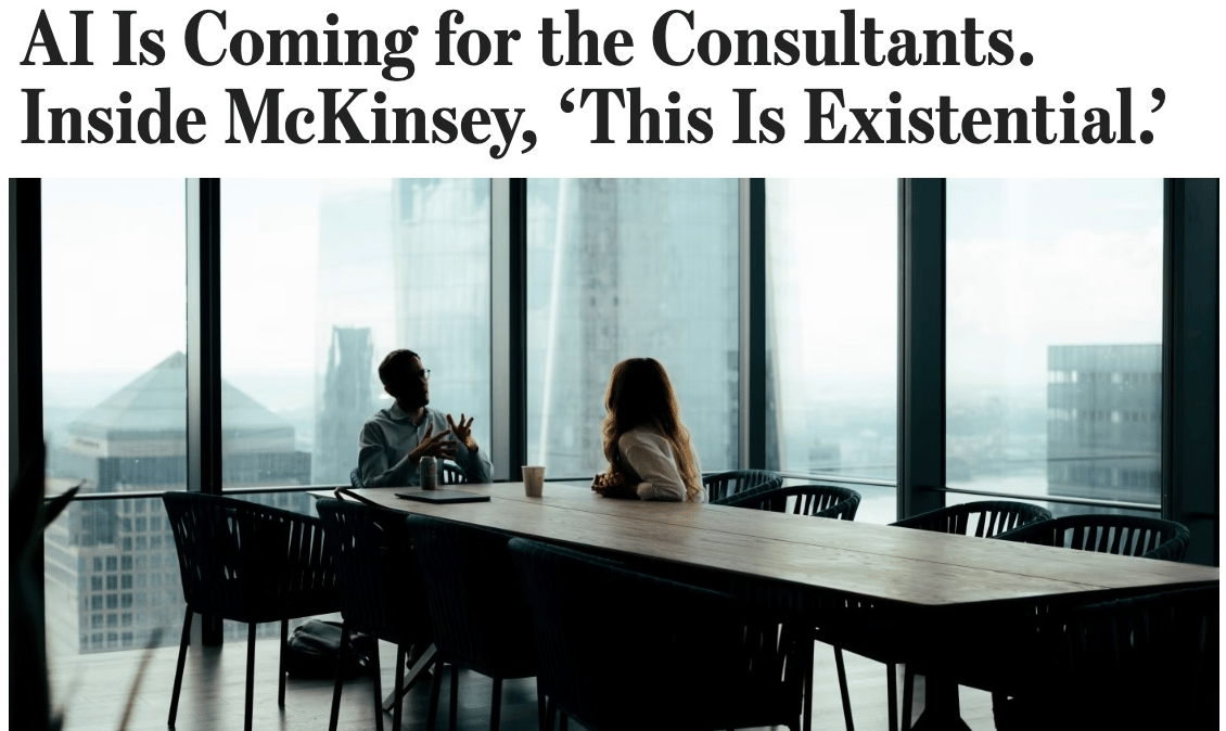 The WSJ article shares that McKinsey has deployed 12,000 AI agents (!!) alongside its 40,000 employees. This is a fundamental change to how they work. However, it seems necessary if the firm seeks to boost productivity AND partner with clients to implement AI solutions.