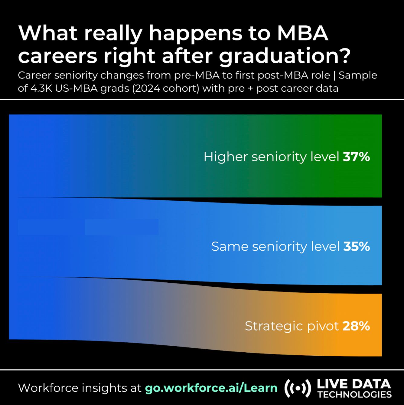 The data tells a really interesting story. About 36% of MBAs moved up in seniority following graduation, whereas 35% stayed at the same level and 28% stepped back in title.