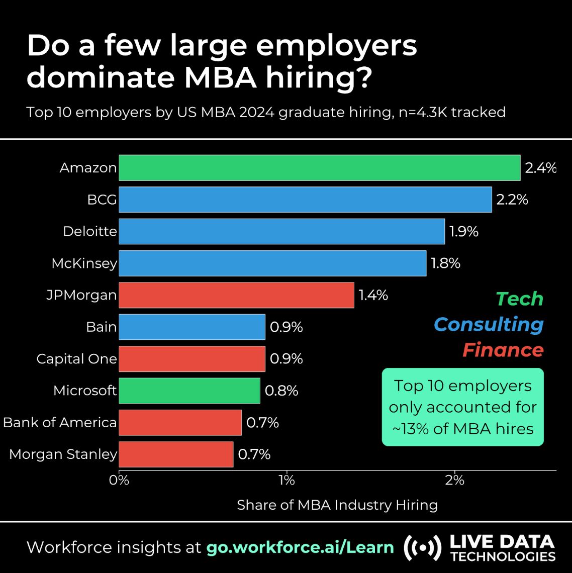 MBA recruiting pipelines don’t just feature big consulting firms and huge tech companies. While Amazon is the single largest employer in the sample, the company hired just 2.4% of MBAs. McKinsey, BCG, and Deloitte are also in the top 10… but, collectively, these top 10 companies hired just 13% of the graduating class.