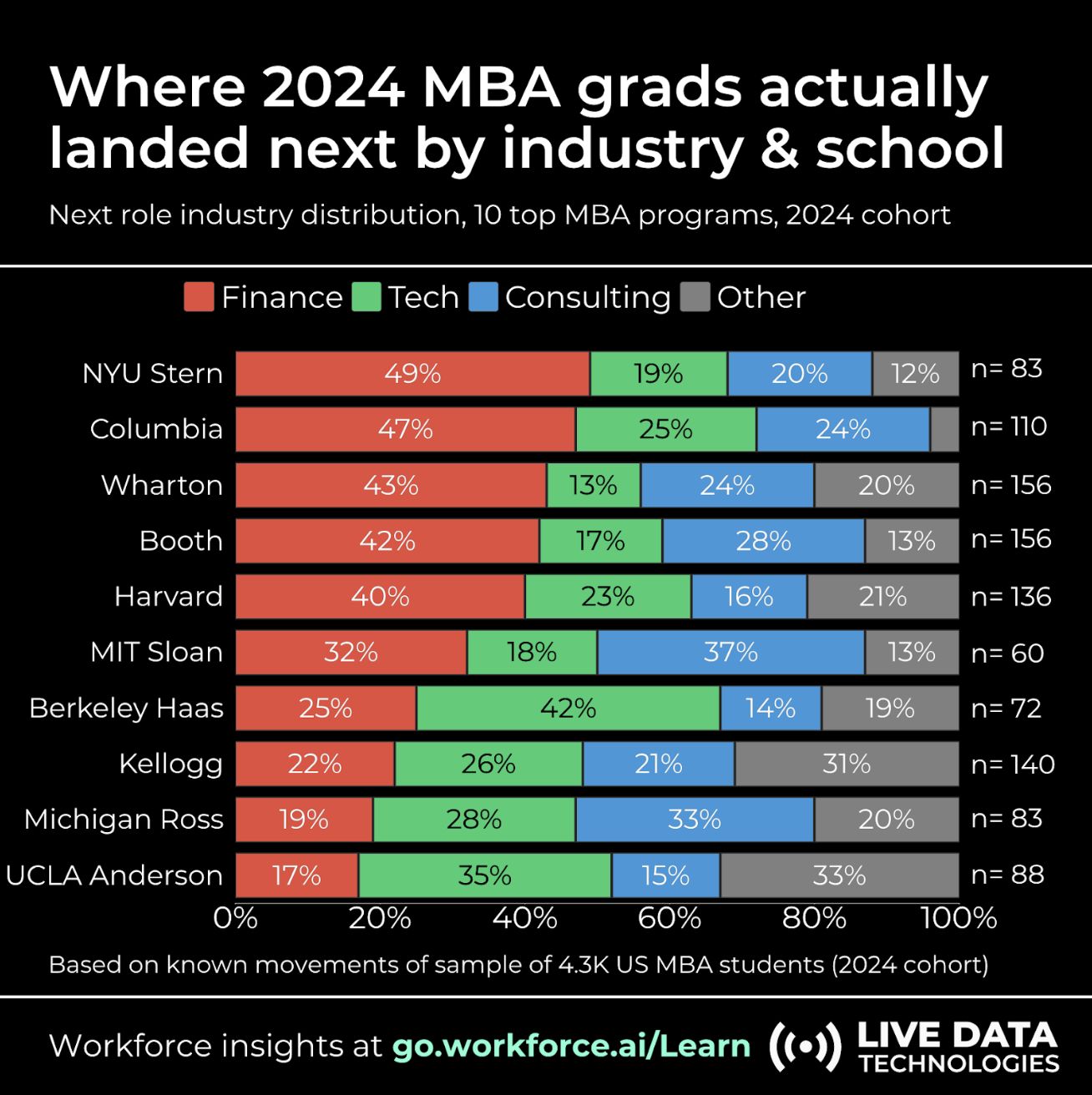 Recently, we collaborated with Alex Hamilton of Live Data Technologies to analyze the post-MBA jobs of 4,231 MBA graduates of the class of 2024.
